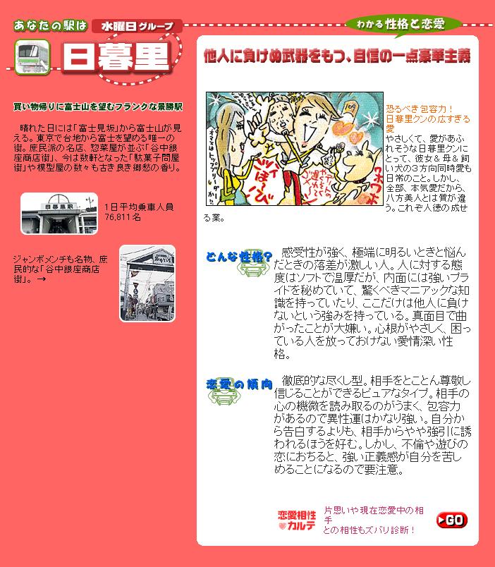 恋愛遍歴を次々に人生のこやしにしていくタイプなので、年齢を重ねるほど失敗は減る。相手に合わせてノリのいい会話をするのでどこに行ってもモテモテだが、本来の性格は、一人の相手を長く愛し続けたいというタイプ。この駅の男はヒモ的体質を持つが、女性にとっては非常にありがたい「あげちん」である。